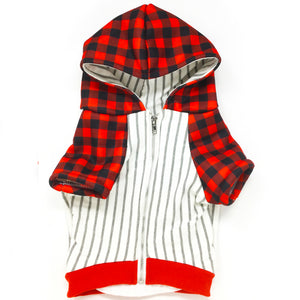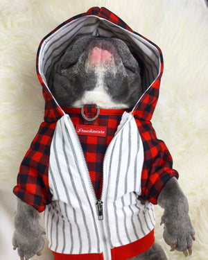 A harness slate - Each of our dog hoodies pair perfectly with our Health Harnesses they were made to correspond together. You can easily attach the leash to the back or the front D ring while your dog is wearing our Frenchie dog organic hoodie.