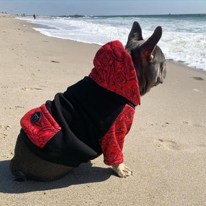 A harness slate - Each of our dog hoodies pair perfectly with our Health Harnesses they were made to correspond together. You can easily attach the leash to the back or the front D ring while your dog is wearing our Frenchie dog organic hoodie.